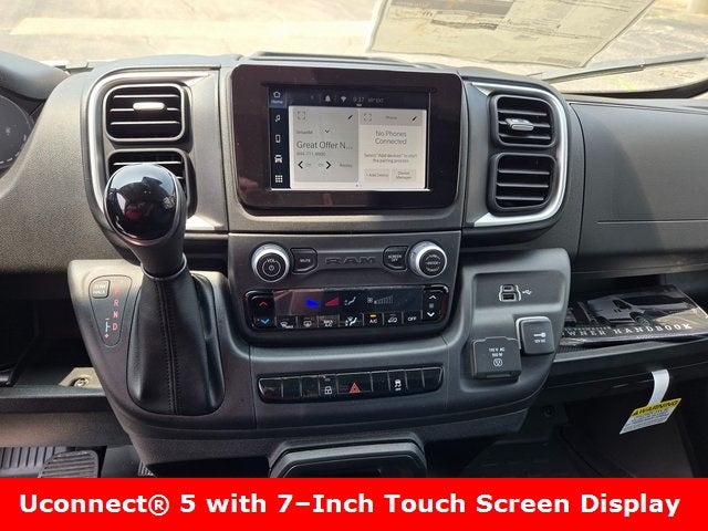 Quick Order Package 22G SLT (100 Amp Battery, 115V Auxiliary Power Outlet, 220 Amp Alternator, 4-Way Manual Adjust Front Passenger Seat, Adaptive Cruise Control w/Stop & Go, Ambient LED Interior Lighting, Auto High Beam Headlamp Control, Automatic Headlamps, Chrome Front Grille, Cluster 7.0 TFT Color Display, Cowl Aesthetic Cover, Exterior Mirrors w/Heating Element, Front LED Fog Lamps, Instrument Panel Bright Bezels, LED Daytime Running Headlamps, LED Reflector Headlamps, ParkSense Rear Park Assist System, Passenger Bucket Seat, Power Adjust Mirrors, Power Folding/Heated Mirrors, Power-Adjustable Convex Aux Mirrors, Rain Sensitive Windshield Wipers, Rear Cargo LED Lamp, Remote Start System, Security Alarm, and Wheels: 16 x 6.0 Aluminum Painted Silver (Fleet)), Rear Heater - A/C Prep Package, Storage Group (Cargo Net, Shelf Above Roof Trim, and Underseat Storage Tray), ProMaster 3500 High Roof 159 WB, 3D Cargo Van, 3.6L V6 24V VVT, 9-Speed 948TE Automatic, FWD, Bright White Clearcoat, Black Cloth, 4 Speakers, 4-Wheel Disc Brakes, 4.08 Axle Ratio, ABS brakes, Air Conditioning, AM/FM radio: SiriusXM, Apple CarPlay/Android Auto, Black/Gray Seats, Bodyside moldings, Brake assist, Class IV Receiver Hitch, Cloth Bucket Seats, Driver door bin, Driver Seat Armrest, Driver's Seat Mounted Armrest, Electronic Stability Control, Exterior Mirrors w/Supplemental Signals, Front anti-roll bar, Front Bucket Seats, Front License Plate Bracket, Front reading lights, Front wheel independent suspension, Heavy Duty Suspension, Illuminated entry, Low tire pressure warning, Manufacturer's Statement of Origin, Outside temperature display, Overhead airbag, Overhead console, ParkView Rear Back-Up Camera, Passenger door bin, Power steering, Power windows, Radio: Uconnect 5 w/7 Display, Rear anti-roll bar, Remote keyless entry, Steering wheel mounted audio controls, Tachometer, Telescoping steering wheel, Traction control, Trip computer, Turn signal indicator mirrors, Variably intermittent wipers, Wheel Center Cap, and Wheels: 16 x 6.0 Steel. 1/4/2027 Exp Date
