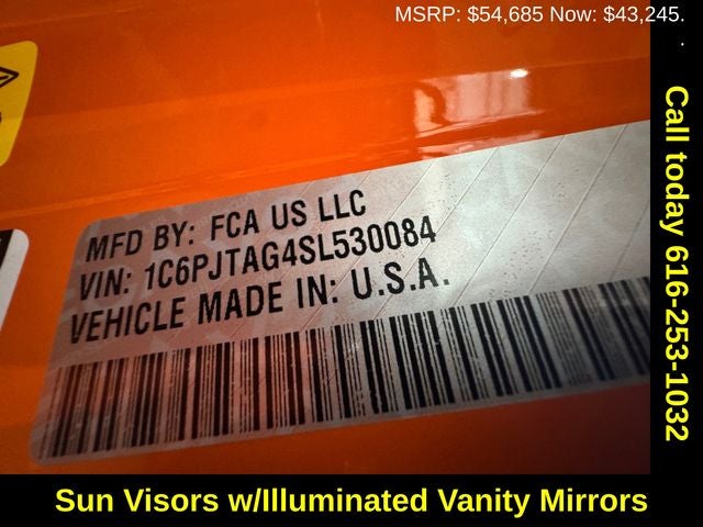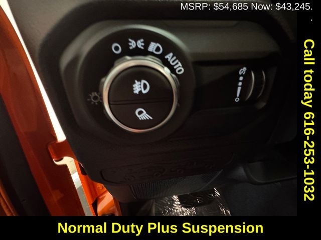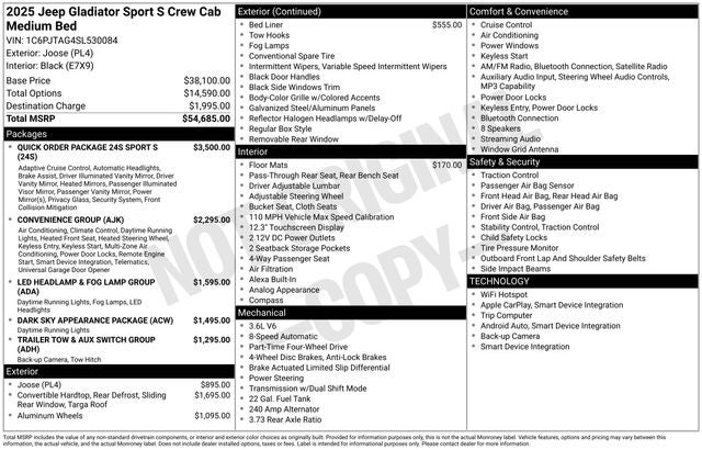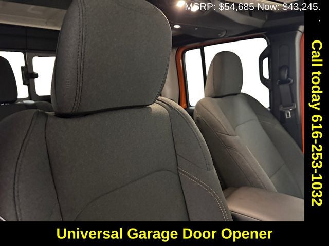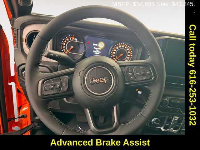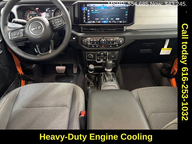 Convenience Group (Corning Gorilla Glass, Daytime Running Lamp System, Emergency/Assistance Call, Front Door Locks 2-Door Passive Entry, Heated Front Seats, Heated Steering Wheel, Remote Start System, and Universal Garage Door Opener), Dark Sky Appearance Package (Body Color Fender Flares (2-Piece), Mold In Color Bumper w/Gloss Black, and Performance Hood), LED Headlamp & Fog Lamp Group (Daytime Running Lamps LED Accents, Front LED Fog Lamps, and LED Premium Reflector Headlamps), Quick Order Package 24S Sport S (Advanced Brake Assist, Automatic Headlamps, Deep Tint Sunscreen Windows, Enhanced Adaptive Cruise Control, Full Speed Forward Collision Warning Plus, Normal Duty Plus Suspension, Power Heated Mirrors, Premium Wrapped Steering Wheel, Security Alarm, Sun Visors w/Illuminated Vanity Mirrors, and Wheels: 17 x 7.5 Gray), Trailer Tow & Aux Switch Group (Auxiliary Switches, Class IV Receiver Hitch, Heavy-Duty Engine Cooling, and Trailer Hitch Zoom), 110 MPH Vehicle Max Speed Calibration, 12.3 Touchscreen Display, 3.73 Rear Axle Ratio, 4-Wheel Disc Brakes, 4G LTE Wi-Fi Hot Spot, 8 Speakers, ABS brakes, Air Conditioning, Alexa Built-In, AM/FM radio: SiriusXM, Apple CarPlay, Apple CarPlay/Android Auto, Black 3-Piece Hard Top, Brake assist, Cloth Low-Back Bucket Seats, Compass, Connectivity - US/Canada, Delay-off headlights, Driver door bin, Driver vanity mirror, Dual front impact airbags, Dual front side impact airbags, Electronic Stability Control, Freedom Panel Storage Bag, Front anti-roll bar, Front Bucket Seats, Front Center Armrest w/Storage, Front fog lights, Front reading lights, Google Android Auto, Illuminated entry, Integrated roll-over protection, Low tire pressure warning, MOPAR All-Weather Slush Mats, MOPAR Spray In Bedliner, Normal Duty Suspension, Occupant sensing airbag, Outside temperature display, Overhead airbag, Panic alarm, ParkView Rear Back-Up Camera, Passenger door bin, Passenger vanity mirror, Power steering, Power windows, Radio data system, Radio: Uconnect 5 w/12.3 Display, Rear anti-roll bar, Rear reading lights, Rear Sliding Window, Rear Window Defroster, Remote keyless entry, Speed control, Split folding rear seat, Steering wheel mounted audio controls, Tachometer, Telescoping steering wheel, Tilt steering wheel, Traction control, Trip computer, USB Host Flip, Variably intermittent wipers, Voltmeter, Wheels: 17 x 7.5 Black Steel Styled, and Wheels: 17 x 7.5 Machined w/Black Pockets. Price includes: $1000 - 2025 National Select Inventory Bonus Cash. Exp. 01/04/2027 $1500 - 2025 National Stellantis Loyalty Retail Bonus Cash . Exp. 02/02/2026 $2250 - 2025 National Retail Bonus Cash . Exp. 02/02/2026