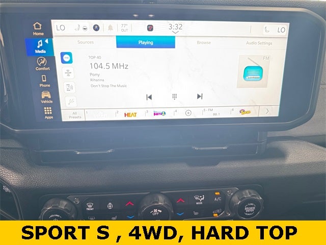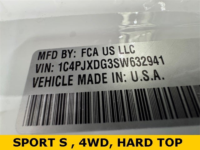 Convenience Group (2-Door Passive Entry, Front Door Locks, Air Conditioning w/Auto Temperature Control, Air Filtering, Cluster 7.0 TFT Color Display, Emergency/Assistance Call, Heated Front Seats, Heated Steering Wheel, Remote Start System, and Universal Garage Door Opener), Quick Order Package 24S Sport S (Advanced Brake Assist, Automatic Headlamps, Corning Gorilla Glass, Deep Tint Sunscreen Windows, Enhanced Adaptive Cruise Control, Full Speed Forward Collision Warning Plus, Power Heated Mirrors, Premium Wrapped Steering Wheel, Security Alarm, Sun Visors w/Illuminated Vanity Mirrors, and Wheels: 17 x 7.5 Gray), Wrangler Sport S, 4D Sport Utility, 3.6L V6 24V VVT, 4WD, 110 MPH Vehicle Max Speed Calibration, 3.45 Overall Top Gear Ratio, 4-Wheel Disc Brakes, 8 Speakers, ABS brakes, Air Conditioning, AM/FM radio: SiriusXM, Apple CarPlay/Android Auto, Aux Battery, Black 3-Piece Hard Top, Brake assist, Cloth Low-Back Bucket Seats, Compass, Delay-off headlights, Driver door bin, Driver vanity mirror, Dual front impact airbags, Dual front side impact airbags, Electronic Stability Control, Freedom Panel Storage Bag, Front anti-roll bar, Front Bucket Seats, Front Center Armrest w/Storage, Front fog lights, Front reading lights, Illuminated entry, Integrated roll-over protection, Low tire pressure warning, MOPAR All-Weather Floor Mats, Non-Lock Fuel Cap w/o Discriminator, Normal Duty Suspension, Occupant sensing airbag, Outside temperature display, Overhead airbag, Panic alarm, ParkView Rear Back-Up Camera, Passenger door bin, Passenger vanity mirror, Power steering, Power windows, Radio data system, Radio: Uconnect 5 w/12.3 Display, Rear anti-roll bar, Rear reading lights, Rear Window Defroster, Rear Window Wiper/Washer, Remote keyless entry, Speed control, Split folding rear seat, Steering wheel mounted audio controls, Stop-Start Dual Battery System, Tachometer, Telescoping steering wheel, Tilt steering wheel, Traction control, Trip computer, Variably intermittent wipers, and Wheels: 17 x 7.5 Black Steel Styled. Prices based on dealer discounts and rebates. Some rebates may be for lease to purchase program, see dealer for details. Not all customers qualify for all rebates.$1500 - 2025 National Bonus Cash . Exp. 02/02/2026 $1500 - 2025 National Stellantis Loyalty Retail Bonus Cash . Exp. 02/02/2026 $2000 - 2025 National Select Inventory Bonus Cash w/ 3FV . Exp. 02/02/2026 $2500 - 2025 National Retail Bonus Cash . Exp. 02/02/2026