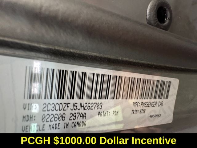 Quick Order Package 23X T/A 392, Challenger T/A 392 6.4 Liter V8 SRT Hemi 2D coupe RWD Manual Transmis, 20 x 9.0 Aluminum Wheels, 8.4 Touchscreen Display, Apple CarPlay/Android Auto, HD Radio, Radio: Uconnect 4C w/8.4 Display, 230MM Rear Axle, 4-Wheel Disc Brakes, 6 Speakers, ABS brakes, Air Conditioning, Alloy wheels, AM/FM radio: SiriusXM, Anti-whiplash front head restraints, Apple CarPlay, Auto-dimming Rear-View mirror, Automatic temperature control, Brake assist, Bumpers: body-color, Compass, Delay-off headlights, Driver door bin, Driver vanity mirror, Dual front impact airbags, Dual front side impact airbags, Electronic Stability Control, Emergency communication system: SiriusXM Guardian, Four wheel independent suspension, Front anti-roll bar, Front Bucket Seats, Front Center Armrest, Front dual zone A/C, Front fog lights, Front reading lights, Fully automatic headlights, Google Android Auto, GPS Antenna Input, Heated door mirrors, Heated steering wheel, Illuminated entry, Integrated Center Stack Radio, Integrated Voice Command w/Bluetooth®, Leather Shift Knob, Low tire pressure warning, Media Hub (2 USB, AUX), MOPAR Cold Air Intake System, Outside temperature display, Overhead airbag, Overhead console, Panic alarm, ParkView Rear Back-Up Camera, Passenger door bin, Passenger vanity mirror, Power door mirrors, Power driver seat, Power steering, Power windows, Radio data system, Rear anti-roll bar, Rear reading lights, Rear seat center armrest, Rear window defroster, Remote keyless entry, Rhombi 2-Pc Wheel Center Cap, Scat Pack Logo Houndstooth Seat, Security system, SiriusXM Satellite Radio, Speed control, Speed-sensing steering, Split folding rear seat, Spoiler, Sport steering wheel, Steering wheel mounted audio controls, Tachometer, Telescoping steering wheel, Tilt steering wheel, Traction control, Trip computer, USB Host Flip, Variably intermittent wipers, Wheels: 20 x 9.5 Forged/Painted Aluminum, and White Face Instrument Cluster.