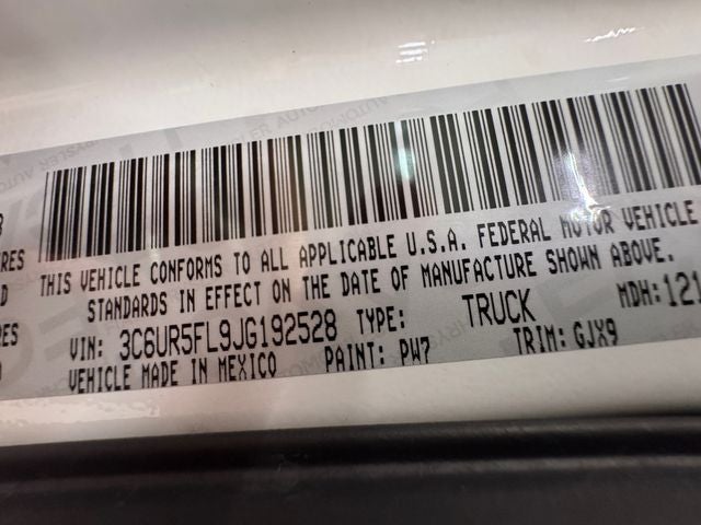 Protection Group, Quick Order Package 2FH Laramie (Front Armrest w/Cupholders), 1-Year SiriusXM Guardian Trial, 10 Speakers, 115V Auxiliary Power Outlet, 4-Wheel Disc Brakes, 40/20/40 Split Bench Seat, 5-Year SiriusXM Traffic Service, 5-Year SiriusXM Travel Link Service, 8.4 Touchscreen Display, ABS brakes, Air Conditioning, Alloy wheels, AM/FM radio: SiriusXM, Apple CarPlay/Android Auto, Audio memory, Auto-dimming door mirrors, Auto-dimming Rear-View mirror, Automatic temperature control, Black Exterior Mirrors, Brake assist, Bumpers: chrome, Chrome Exterior Mirrors, Compass, CTR Stop Lamp w/Cargo View Camera, Delay-off headlights, Driver door bin, Driver vanity mirror, Dual front impact airbags, Dual front side impact airbags, Electronic Stability Control, Emergency communication system: SiriusXM Guardian, Exterior Mirrors Courtesy Lamps, Exterior Mirrors w/Heating Element, Exterior Mirrors w/Memory, Exterior Mirrors w/Supplemental Signals, Front anti-roll bar, Front Center Armrest w/Storage, Front dual zone A/C, Front fog lights, Front reading lights, Fully automatic headlights, Garage door transmitter, GPS Antenna Input, GPS Navigation, HD Radio, Heated door mirrors, Heated Front Seats, Heated front seats, Heated steering wheel, Illuminated entry, Integrated Center Stack Radio, Integrated Voice Command w/Bluetooth®, Keyless Enter-N-Go, Leather steering wheel, Leather Trim 40/20/40 Bench Seat, LED Bed Lighting, Low tire pressure warning, Manufacturer's Statement of Origin, Media Hub (2 USB, AUX), Memory seat, Occupant sensing airbag, Outside temperature display, Overhead airbag, Overhead console, Panic alarm, ParkView Rear Back-Up Camera, Passenger door bin, Passenger vanity mirror, Power door mirrors, Power driver seat, Power Folding Chrome Trailer Tow Mirrors, Power Folding Mirrors, Power passenger seat, Power steering, Power windows, Radio data system, Radio: Uconnect 4C Nav w/8.4 Display, Radio: Uconnect 4C w/8.4 Display, Rear seat center armrest, Rear step bumper, Remote keyless entry, Remote Proximity Keyless Entry, Remote Start System, Security system, SiriusXM Satellite Radio, SiriusXM Traffic Plus, SiriusXM Travel Link, Speed control, Split folding rear seat, Steering wheel mounted audio controls, Tachometer, Tilt steering wheel, Traction control, Trailer Tow Mirrors, Trip computer, Turn signal indicator mirrors, Variably intermittent wipers, Vendor Painted Cargo Box Tracking, Ventilated front seats, Voltmeter, and Wheels: 18 x 8.0 Polished Aluminum.