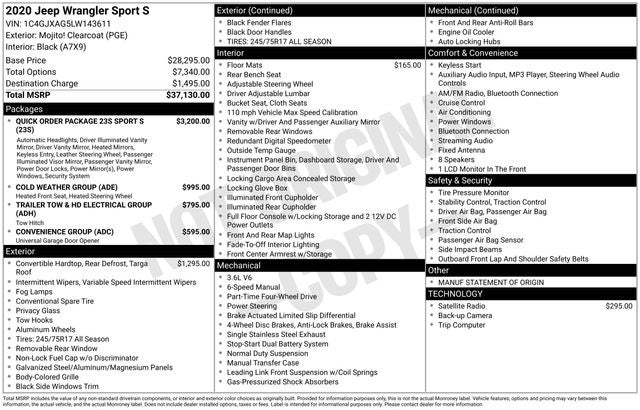 This 2020 Jeep Wrangler Sport S is a rugged and capable off-road machine that's ready to take you on all your adventures. Equipped with a powerful 3.6L V6 engine and a smooth 6-speed manual transmission, this Wrangler delivers impressive performance both on and off the pavement. The included features like the Quick Order Package 23S, Convenience Group, and Cold Weather Group add a wealth of premium amenities to enhance your driving experience.