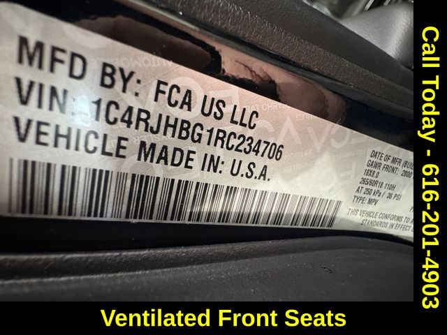 Luxury Tech Group II (2nd-Row Manual Window Shades, Auto-Dimming Exterior Driver Mirror, Capri Leatherette w/Axis II Seats, Front/Rear Doors & Liftgate w/Passive Entry, Integrated Off-Road Camera, Intersection Collision Assist System, Memory Steering Column, ParkSense Front/Rear Park Assist w/Stop, Power Tilt/Telescope Steering Column, Rain Sensitive Windshield Wipers, Rear Back-Up Camera Washer, Rearview Autodim Digital Display Mirror, Surround View Camera System, Ventilated Front Seats, and Wireless Charging Pad), Trailer Tow Package (220 Amp Alternator, 7 & 4-Pin Wiring Harness, Automatic Headlamp Levelling System, Class IV Receiver Hitch, Heavy-Duty Engine Cooling, Rear Load Levelling Suspension, and Trailer Hitch Zoom), Quick Order Package 22E, Dual-Pane Panoramic Sunroof, Heated front seats, Navigation System, Power Liftgate, Radio: Uconnect 5 Nav w/10.1 Display, 3.45 Rear Axle Ratio, 4-Wheel Disc Brakes, 6 Speakers, ABS brakes, Active Noise Control System, Air Conditioning, Alloy wheels, AM/FM radio: SiriusXM with 360L, Anti-whiplash front head restraints, Audio memory, Auto High-beam Headlights, Automatic temperature control, Brake assist, Bumpers: body-color, Capri Leatherette Seats, Compass, Delay-off headlights, Driver door bin, Driver vanity mirror, Dual front impact airbags, Dual front side impact airbags, Electronic Stability Control, Emergency communication system, Four wheel independent suspension, Front anti-roll bar, Front Bucket Seats, Front Center Armrest w/Storage, Front dual zone A/C, Front fog lights, Front reading lights, Fully automatic headlights, Garage door transmitter, Heated door mirrors, Heated rear seats, Heated steering wheel, Illuminated entry, Knee airbag, Low tire pressure warning, Memory seat, Normal Duty Suspension, Occupant sensing airbag, Outside temperature display, Overhead airbag, Overhead console, Panic alarm, ParkView Rear Back-Up Camera, Passenger door bin, Passenger vanity mirror, Power door mirrors, Power driver seat, Power passenger seat, Power steering, Power windows, Radio data system, Rear anti-roll bar, Rear reading lights, Rear window defroster, Rear window wiper, Remote keyless entry, Security system, Speed control, Speed-Sensitive Wipers, Split folding rear seat, Spoiler, Steering wheel mounted audio controls, Tachometer, Telescoping steering wheel, Tilt steering wheel, Traction control, Trip computer, Turn signal indicator mirrors, Variably intermittent wipers, Voltmeter, and Wheels: 18 x 8 Polished/Painted Aluminum.